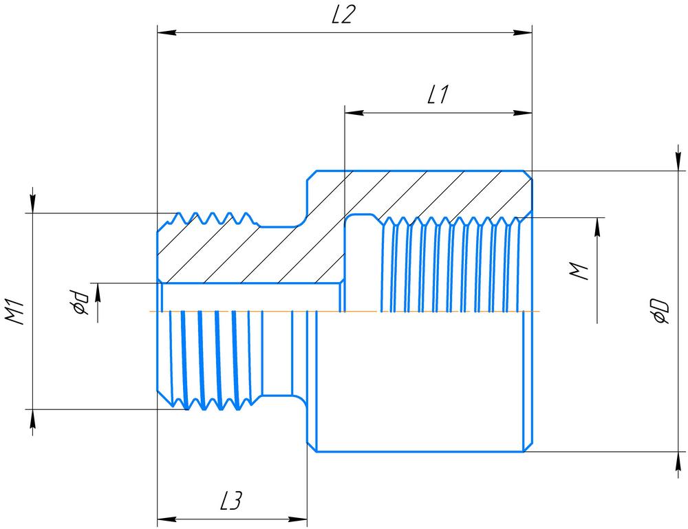 | Наименование | Наружная резьба М1 | Внутренняя резьба М | L1 | L3 | ØD | Ød | L2 |
