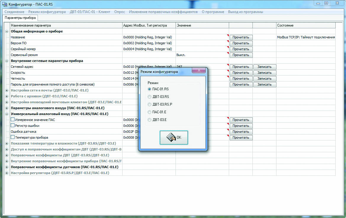 Прибор поставляется совместно с программой-конфигуратором ПАС-ДВТ, которая постоянно совершенствуется и распространяется бесплатно. Программа имеет удобный графический интерфейс, позволяющий легко работать с программой. При помощи программы можно не только производить поиск, регистрацию и конфигурирование приборов в сети, но также регистрировать данные измерений с представлением информации в виде таблицы и графика.