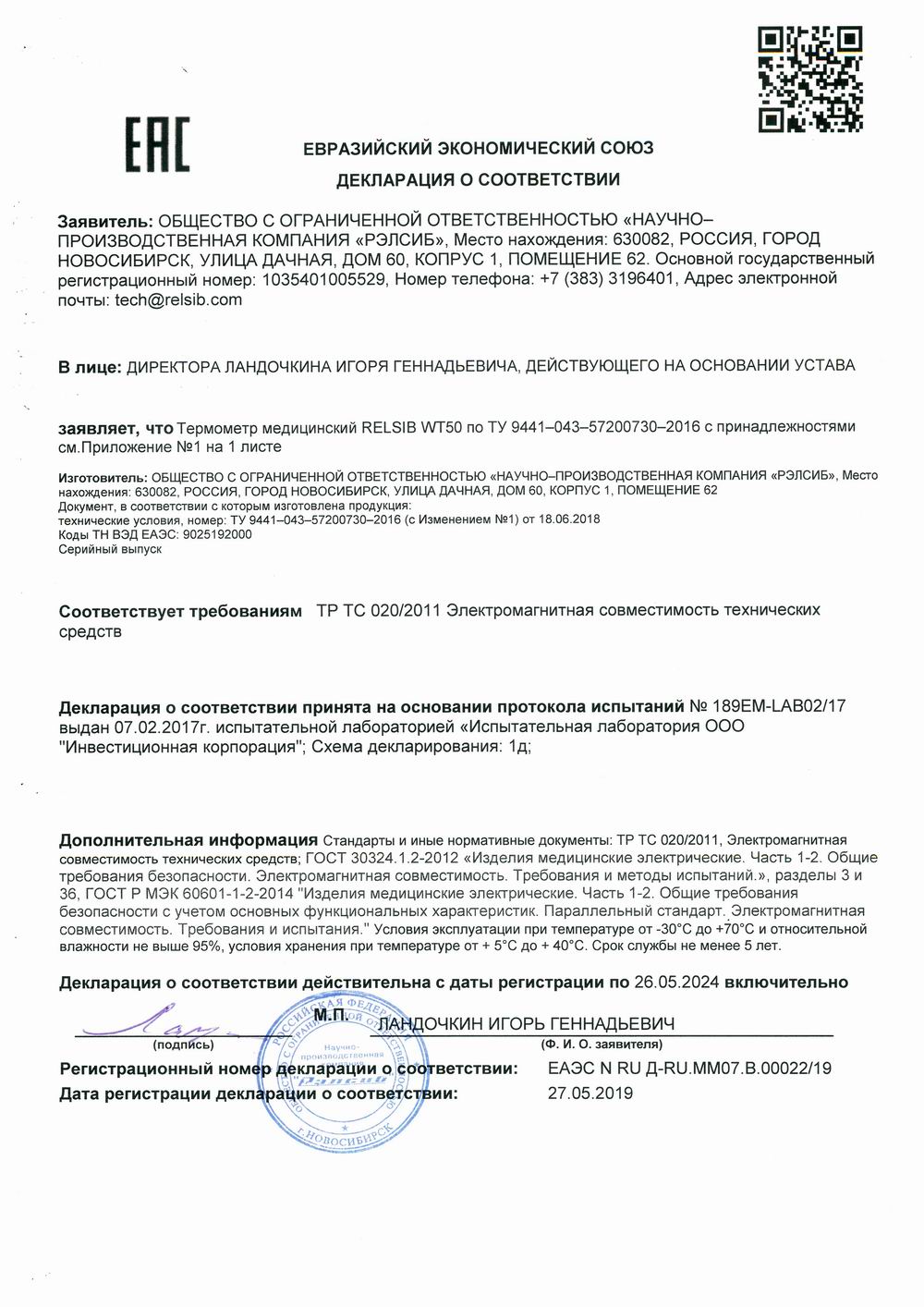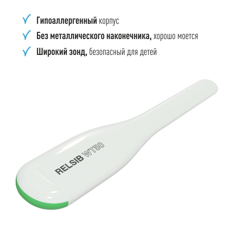 RELSIB WT50 – первый электронный медицинский термометр, разработанный и произведенный в России. Регистрационное удостоверение Минздрава №РЗН 2019/8273.